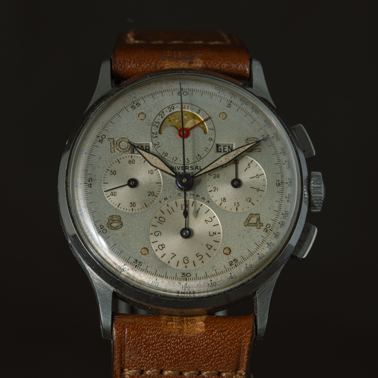 The Universal Genève Tri-Compax is a milestone in vintage horology, celebrated for its elegant design and mechanical sophistication. This stainless steel example with a 35 mm case retains all its original traits prized by collectors: snap-on caseback engraved with Universal Genève markings, flat chronograph pushers, and three correctors on the left side for the calendar and moon phase functions. The white dial has developed a charming and even patina over time and features hand-painted Arabic numerals—adding to its vintage charm. Powering the watch is Universal Genève’s in-house caliber 481, a manual-winding movement with 17 jewels and straight-line lever escapement—an impressive mechanical feat of its era. The watch is in good, unaltered condition, ideal for connoisseurs of post-war complicated chronographs.