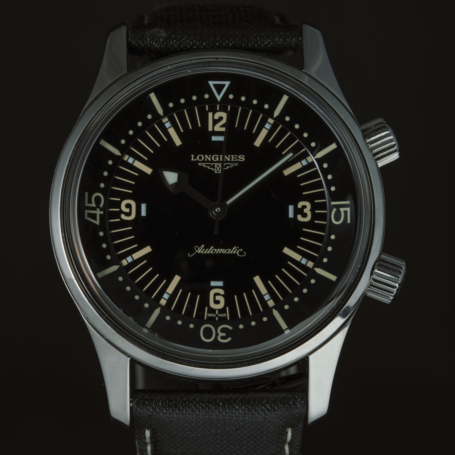 Il quadrante nero garantisce eccellente leggibilità grazie agli indici applicati e alle lancette generosamente luminescenti, con numeri arabi ai quarti e triangolo a ore 12. Il movimento automatico Longines L633, derivato dall’affidabile ETA 2824-2, assicura precisione e robustezza. Proposto con scatola e documenti originali, in condizioni prossime al nuovo, è un omaggio autentico alla tradizione subacquea Longines.