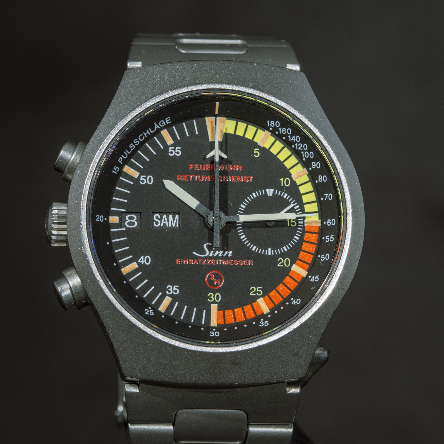 Quadrante: quadrante nero con scala multicolore altamente funzionale, che integra una scala pulsometrica (“PulsSchläge”). Indici e lancette con lume al trizio virato nel tempo verso una tonalità crema. Presenza di contatore cronografico e finestre giorno/data in lingua tedesca.